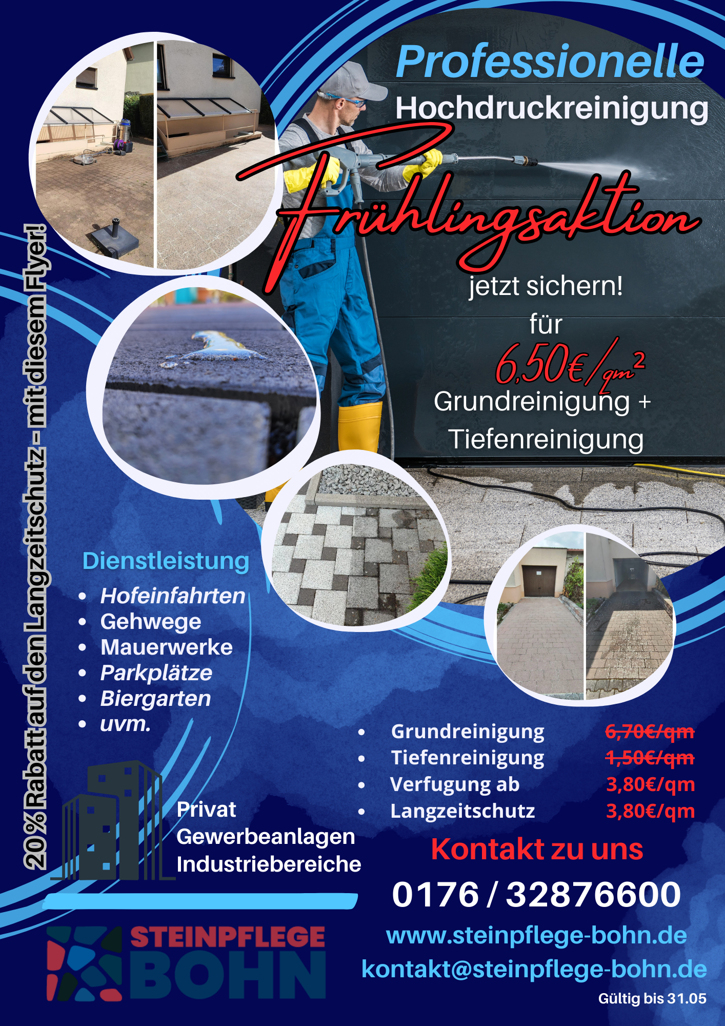 Steinpflege Bohn ist Ihr Spezialist für schonende und zugleich effektive Hochdruckreinigung mit bis zu 350 Bar Wasserdruck und umweltfreundlicher Tiefenreinigung – ganz ohne Chemie! Durch unsere spezielle Nano-Imprägnierung bleibt Ihr Steinbelag langfristig geschützt und sauber.